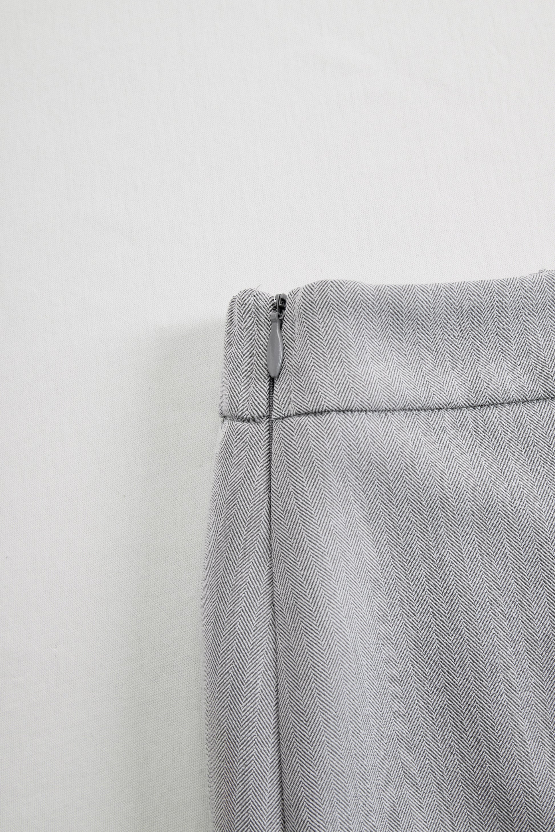 Paired with a sleek pencil skirt in matching herringbone fabric, this set delivers an effortlessly polished look. The skirt's streamlined cut enhances the natural curves, ensuring a professional yet alluring presence. Together, the blazer and skirt form an ensemble perfect for women who value strong tailoring with a touch of classic luxury.